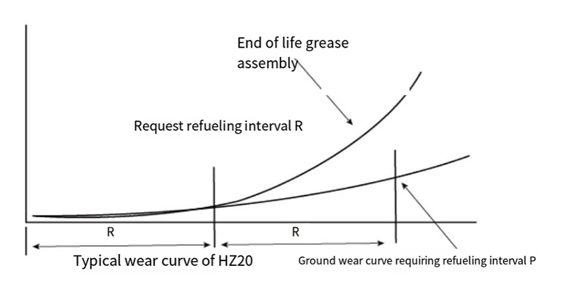 Khi ống lót HZ20 được lắp đặt bằng mỡ bôi trơn như mỡ gốc lithium hoặc silicon. Tuổi thọ sử dụng của nó thay đổi so với giá trị PV trong điều kiện làm việc. chẳng hạn. khi giá trị PV khoảng 2,5MPam/s. tuổi thọ của nó sẽ vào khoảng 200 giờ; khi giá trị PV là 0,1Mpa-m/s, tuổi thọ sử dụng của nó có thể cao hơn I0,0oohr (xem bảng để biết chi tiết) Chu kỳ R bảo dưỡng bôi trơn của ống lót HZ20 là khoảng một nửa tuổi thọ sử dụng của nó. Ví dụ: khi PV=25Mpam/s. nó được yêu cầu phải được bôi trơn bằng dầu cứ sau 100 giờ.